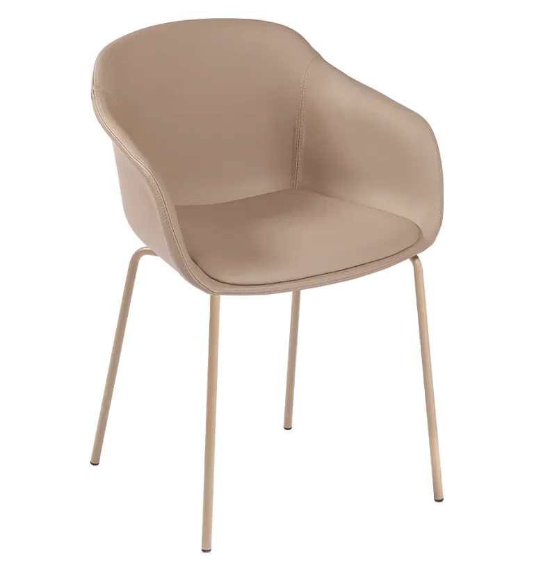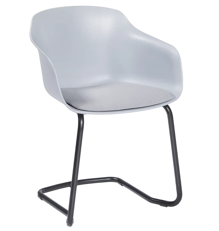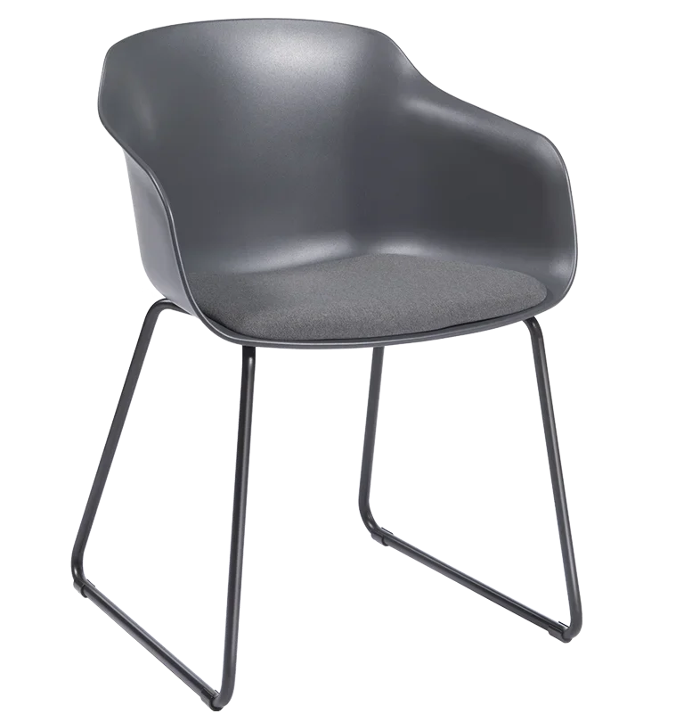 Structure à 4 pieds en métal chromé ou peint, coque en technopolymère et coussin rembourré.
